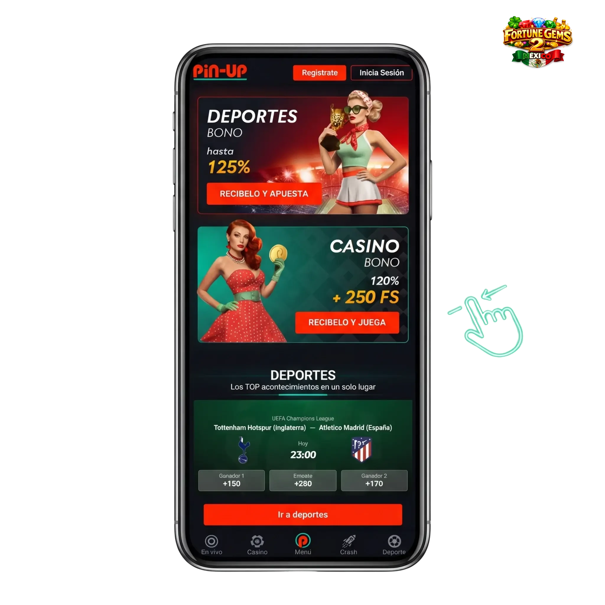 Ingresa el código promocional PINUP2024 al registrarte para obtener valor adicional en Fortune Gems 2. También puedes aplicarlo desde la sección “Mis bonos” dentro de la app una vez que hayas creado tu cuenta.